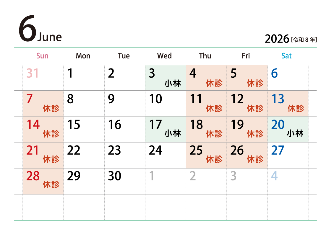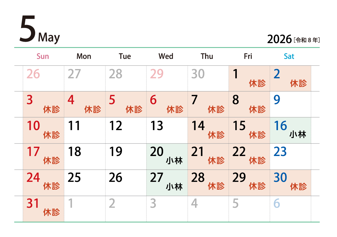 ◆1日・15日・18日は小林医師の診察です。