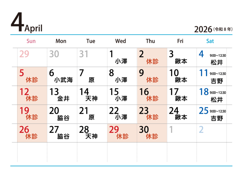 整形外科 4月の診療に関してのお知らせ - 2026-02-13整形外科
